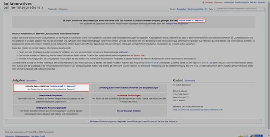 Hier finden Sie eine kurze Schritt-für-Schritt Anleitung zur Interpretation mit dem Wiki "kollaboratives online-Interpretieren". Die Verwendung des Wikis ist möglichst selbsterklärend und simpel angelegt. Sollten bei der Verwendung Probleme auftreten, melden Sie sich bitte via dem Kontaktformular und wir werden Ihnen mit Rat zur Seite stehen.