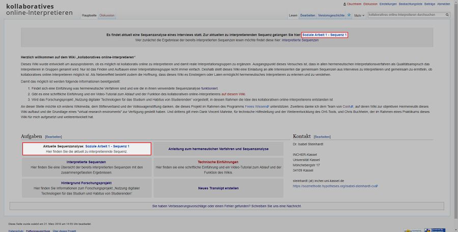 Um an der Interpretation teilnehmen zu können, müssen Sie sich zunächst zur aktuellen Sequenzanalyse navigieren. Sie finden den Link zur aktuellen Sequenzanalysen immer auf der Startseite des Wikis: Zum einen im Hinweiskasten im oberen Teil und zum anderen im ersten Kasten unter "Aufgaben". Außerdem können Sie auch eine Übersicht aller Sequenzanalysen unter dem Punkt Interpretierte Sequenzen finden und von dort zur aktuellen Sequenzanalyse gelangen. Bitte beachten Sie, dass für die Interpretation jeder Sequenz ein festgelegter Zeitrahmen existiert. Interpretationen, die außerhalb diesen Rahmens eingereicht werden, können leider nicht berücksichtigt werden.